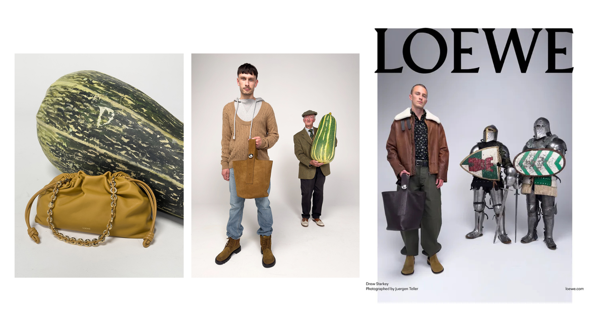L'absurde s'invite jusque dans les codes du luxe, en témoigne Loewe avec sa dernière campagne printemps-été 2025. Des culturistes qui posent à côté d’une courge géante, un chevalier en armure qui affiche fièrement son petit sac en cuir... Tout semble sorti d’un mauvais rêve. Et pourtant, la stratégie est parfaitement maîtrisée. Jonathan Anderson, directeur artistique de la maison, connaît son audience sur le bout des doigts : des clients jeunes et férus de culture pop, pour qui le mélange d’absurde et d’art est un territoire familier.